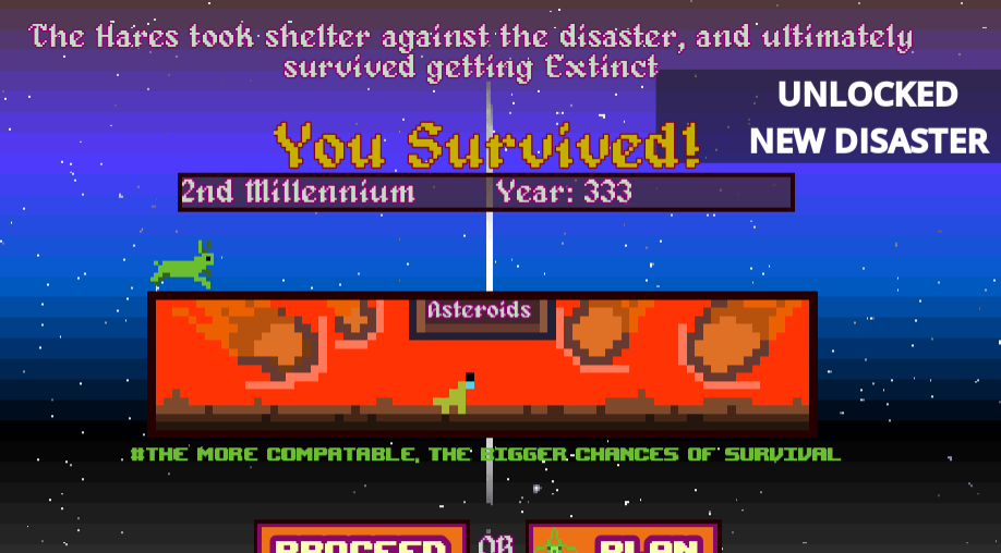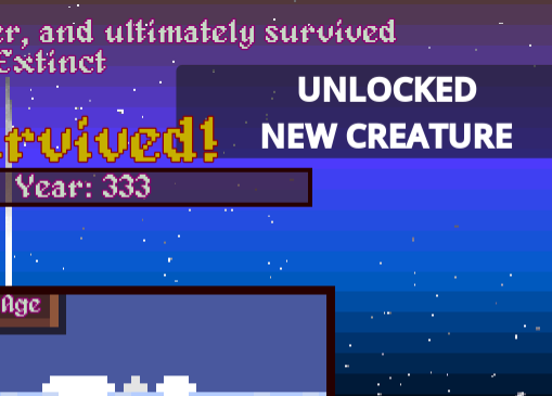 Simulation Display -> the creature you chose will now encounter the Disaster, and it will depend if you will get Extinct or Survive. After each simulation, on the top you will see how much effort your Creature did to try and Survive, this can give you clues on what that creature does.